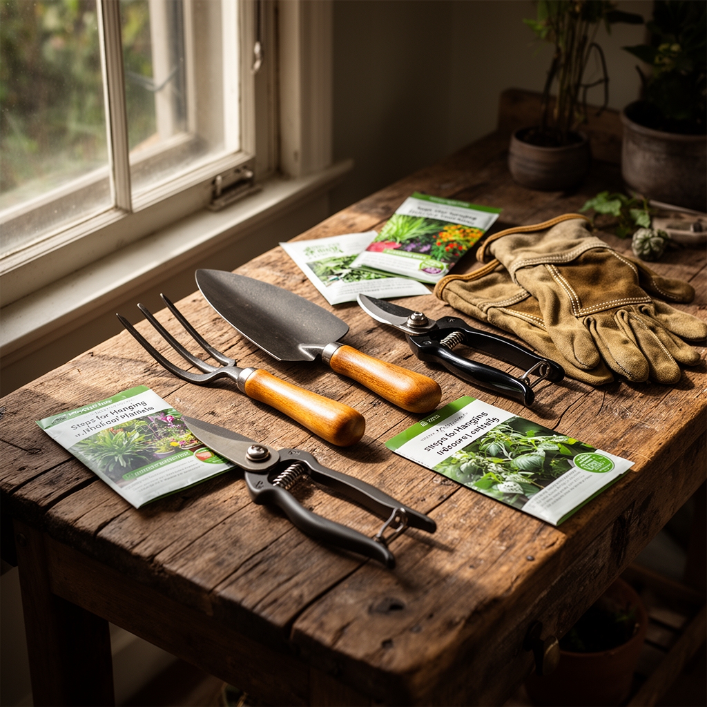 Hardware checklist includes a stud finder calibrated for wood or metal joists, a drill with 1/4-inch masonry bits for drywall anchors, S-hooks rated to 35 pounds, and braided steel cable or polyester macrame cord with 50-pound test strength. A laser level ensures horizontal alignment across multiple installations.